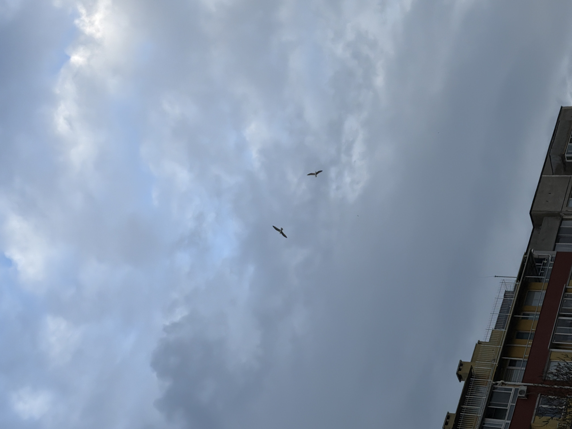 low-angle view of a cloudy sky with two birds flying in formation. The birds appear to be seabirds, possibly seagulls, judging by their shape. In the bottom right corner, a tall building is visible, its structure consisting of multiple floors with windows. The building's facade is a combination of brown and yellow. The sky is dominated by gray and white clouds, suggesting an overcast day. The image has an urban setting.