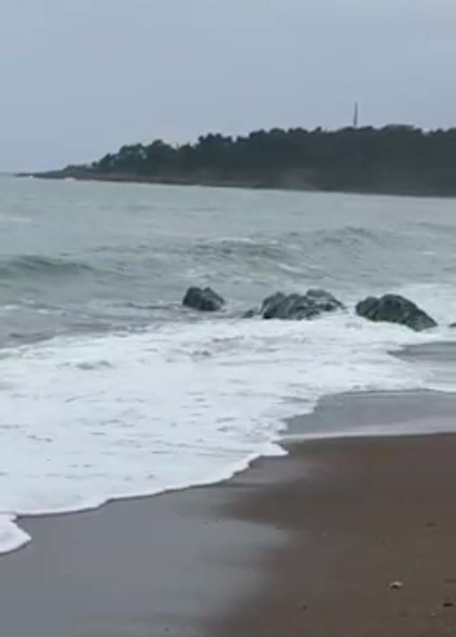 beach on a cloudy day. Waves are crashing on the shore, and there are some rocks in the water. The sand is brown, and there is a green hillside in the background.