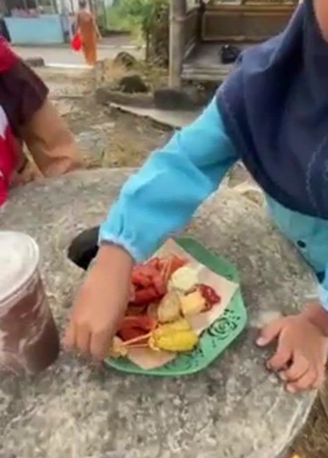 Two young girls are seated at a stone table outdoors. The girl in the foreground wears a light blue hijab and matching jacket; she reaches for food items on a green plate. The plate contains various foods on sticks, some with red sauce. The girl beside her wears a brown uniform and a brown and white scarf. Next to her sits a plastic cup with a brown liquid. The table has a hole in the center. In the background, a person in orange walks on a path, and there's a small wooden structure nearby. The environment seems to be a park or outdoor area.