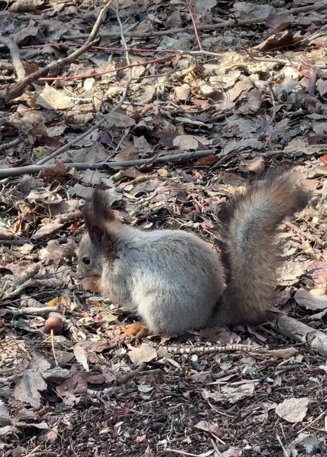 squirrel on a forest floor covered in leaves, twigs, and other debris. The squirrel is sitting amidst the leaf litter, holding something in its paws and nibbling on it. The squirrel has a bushy tail and tufted ears. Sunlight filters through the trees, creating light and shadows on the forest floor. A voice can be heard in the background.