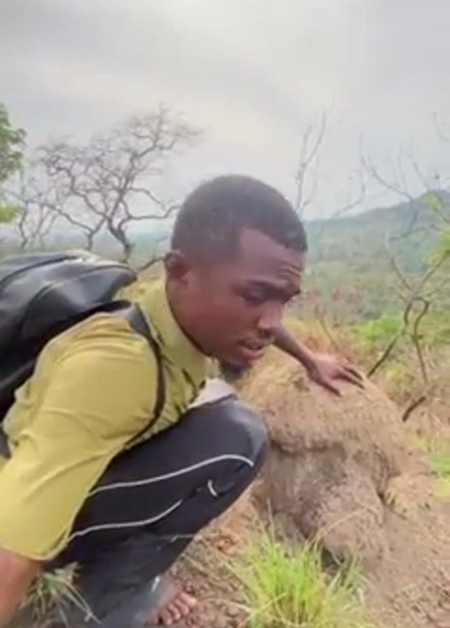 A man is squatting in a mountainous area near an anthill. He has on a light green, long-sleeved shirt, black pants with white stripes down the side, and black sandals. He has a backpack on. He is looking at the camera. He places his hand on the anthill and says he wants to see who is behind it, and that he is going to uproot it. In the background, there are green, tree-covered mountains and a blue, partially cloudy sky with the sun shining. There are trees with bare branches in the foreground. The ground is covered with dirt and small patches of grass.