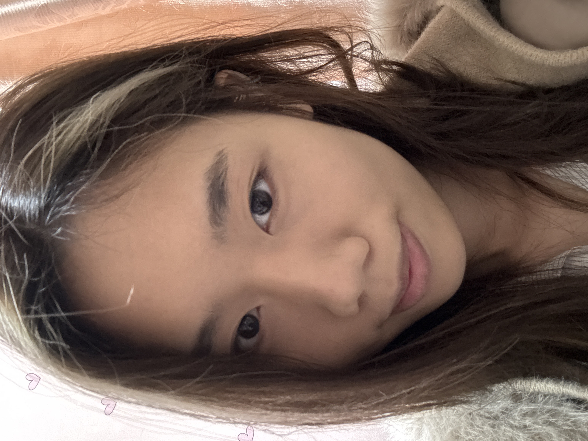 A young woman with long, brown hair with blonde streaks is lying down, looking into the camera. The background appears to be a light-colored, soft material, possibly a blanket or pillow. She is wearing a beige top. Small, stylized heart shapes are present in the lower left corner of the image. No features are visible that would allow for the determination of the location in Shapingba District, China.