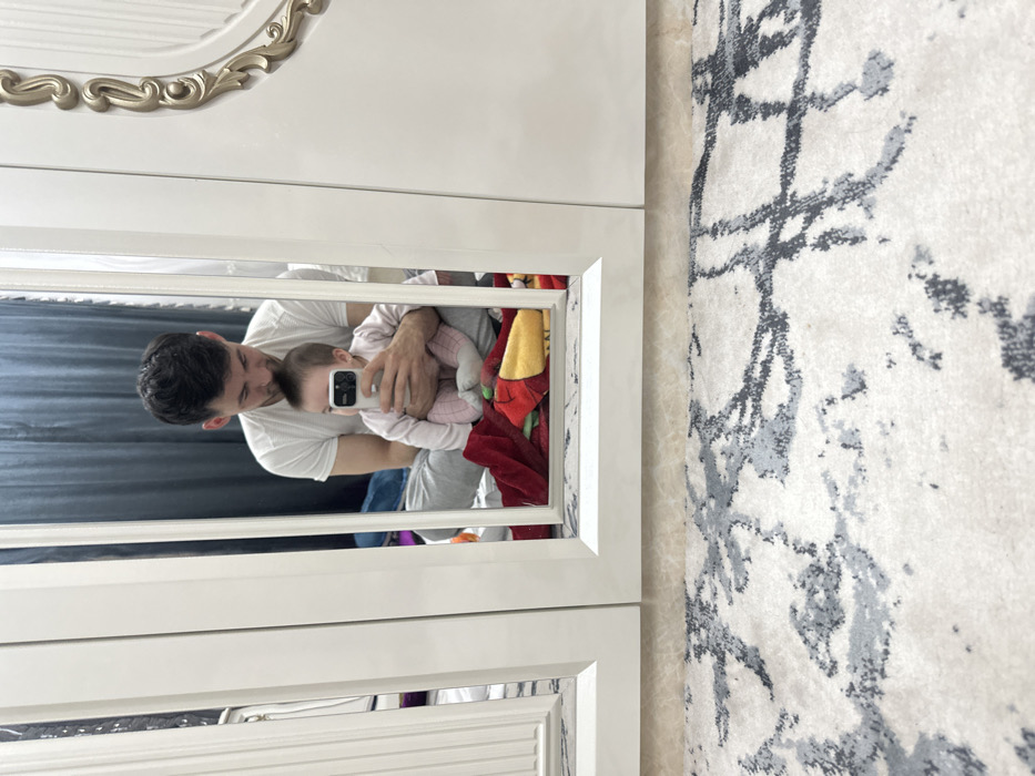 A reflection in a mirror shows a man in a white t-shirt holding a baby wearing pink clothing. The man holds a cell phone as if taking a photo. A dark curtain is behind them. The mirror is part of a white, ornate wardrobe. A patterned rug in shades of gray and white is to the right of the wardrobe.