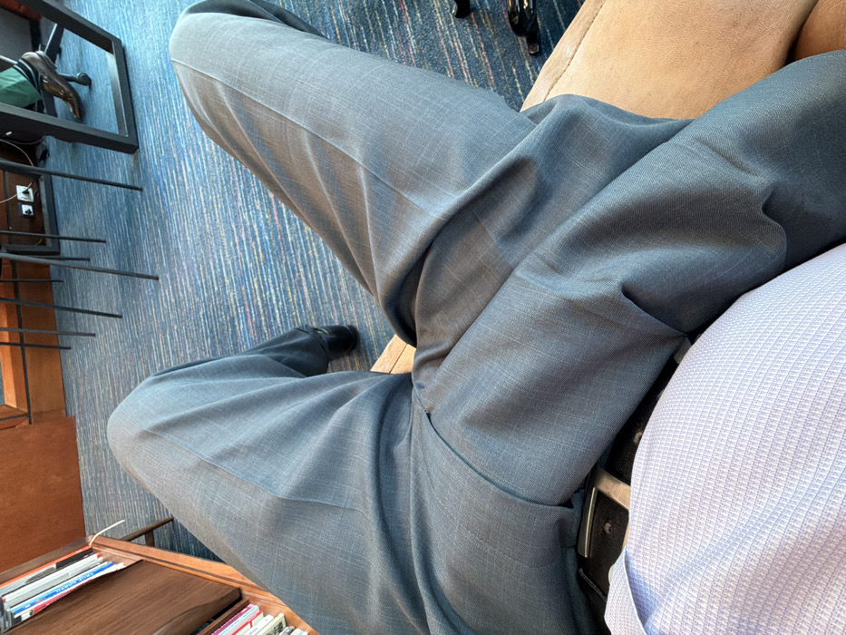 The image captures a first-person perspective of an individual seated in an indoor environment in Las Condes, Chile. The primary subject wears a light blue textured dress shirt, a black belt with a silver-colored buckle, and light grey dress pants, with their legs slightly spread. The immediate foreground features a section of a light-colored upholstered seat. The floor is covered by a blue patterned carpet exhibiting horizontal, wavy stripes in varying shades of blue, grey, and subtle lighter tones. To the left, a wooden bookshelf filled with books is partially visible. In the background, to the right, the lower leg of another individual is seen, wearing dark green pants and a brown dress shoe, seated at a table or desk supported by black metal legs. A power outlet is visible on a wall panel behind this secondary figure. A dark, unidentifiable object rests on the carpet near the primary subject's right leg.