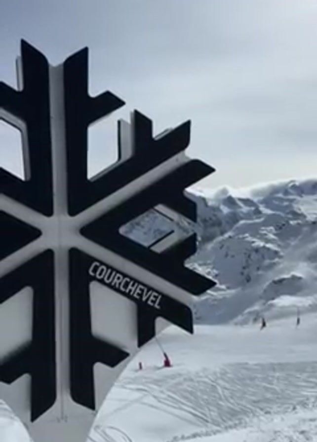 sign that says "COURCHEVEL" on it, in the shape of a snowflake, with a snowy mountain range in the background. The sky is bright and the sun is shining. The ground is covered in snow, with tracks in it. There are a few red flags on the snowy slopes.