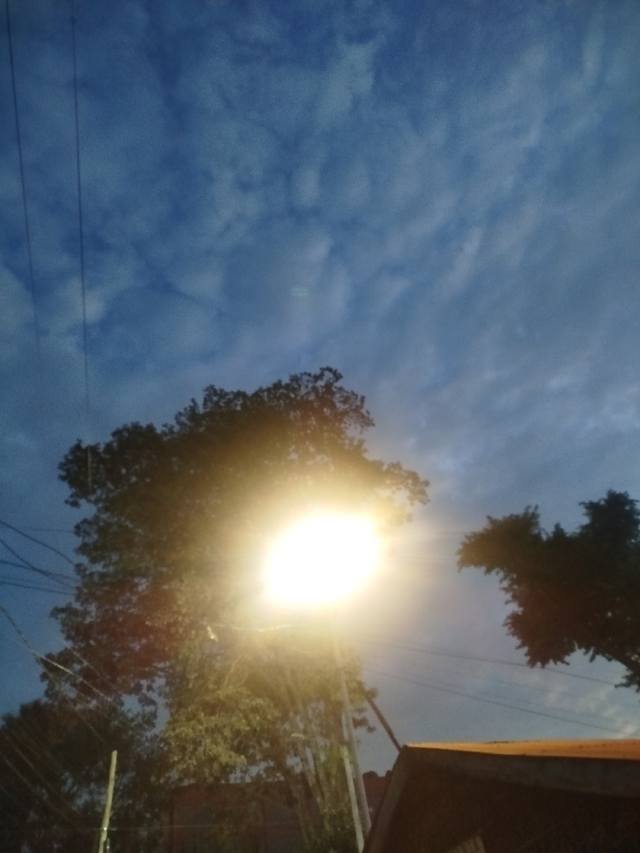 A streetlamp illuminates the scene with a bright, almost blinding light, positioned amidst lush trees silhouetted against a blue, cloud-dappled sky. Electrical wires crisscross the upper-left quadrant, adding a layer of urban texture. The lower-right corner features a dark rooftop, grounding the composition and suggesting a residential setting. The scene exudes a tranquil, almost surreal quality, enhanced by the juxtaposition of natural elements and artificial illumination.