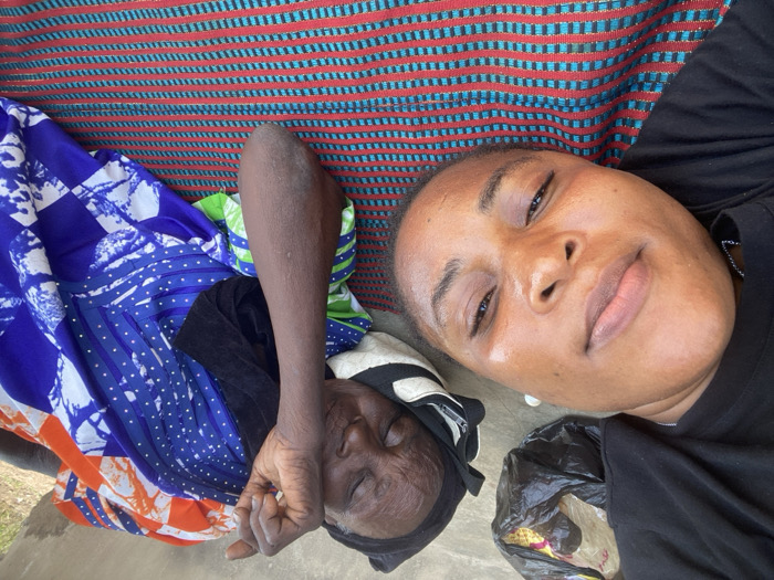 In Idiroko, Nigeria, two individuals are observed lying on a horizontally striped mat (red, blue, black) on a light-colored, possibly concrete, surface. The individual on the left is younger, appearing female, with dark skin and dark hair, wearing a black short-sleeved top. Her eyes are open, and she is looking directly at the camera with a slight upward curve to her lips. A black plastic bag is positioned behind her head. The individual on the right is an elderly female with dark, wrinkled skin. She is wearing a dark headscarf and a patterned garment featuring blue, white, orange, and green colors. Her eyes are closed, indicating sleep. Her right arm is bent, resting near her head, which is supported by a light-colored object, possibly a pillow or shoe. The background suggests an outdoor or semi-outdoor setting with some indistinct light-colored structures and sparse greenery.