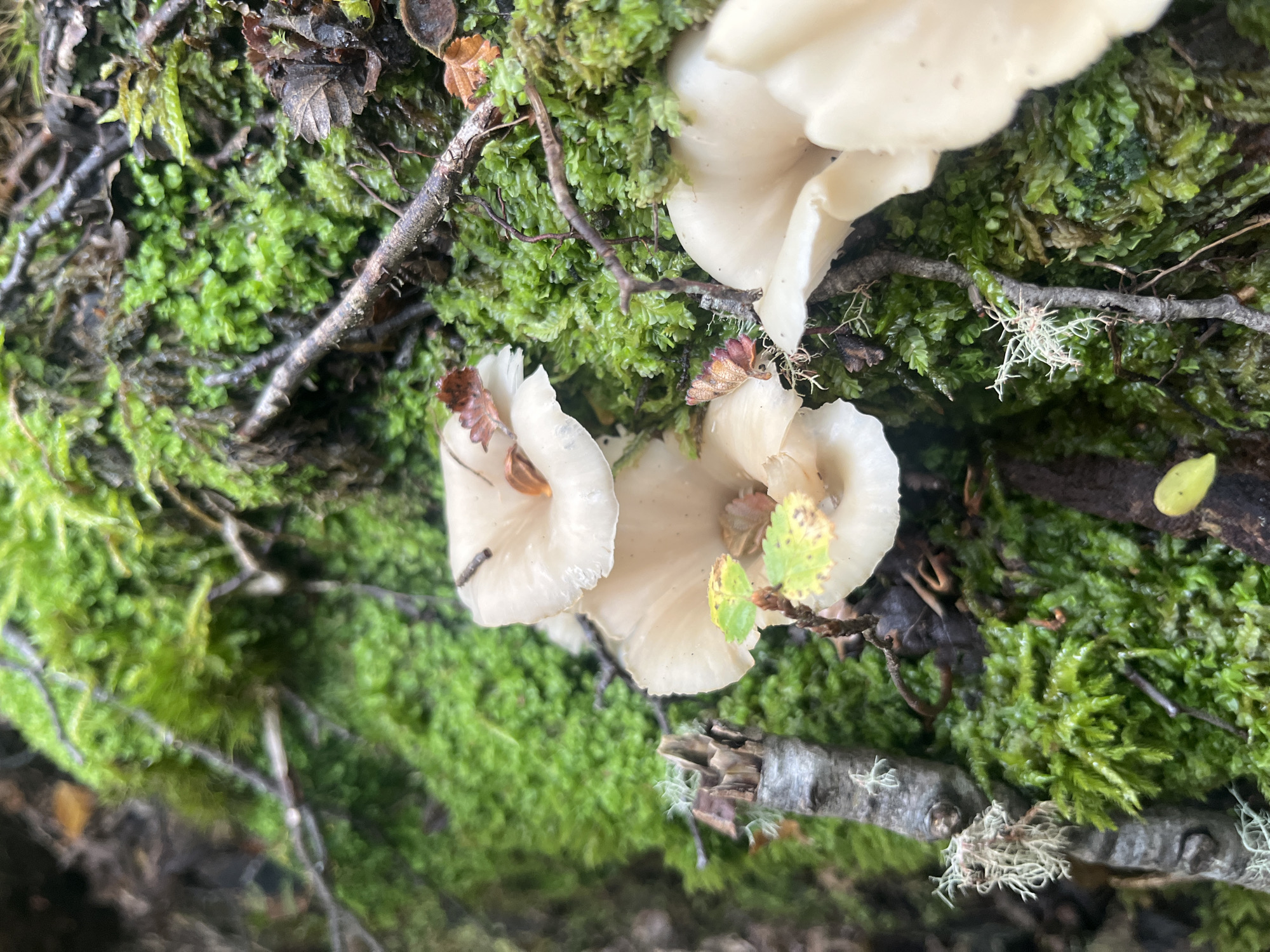 close-up view of a cluster of pale, possibly white, mushrooms growing on a substrate of vibrant green moss