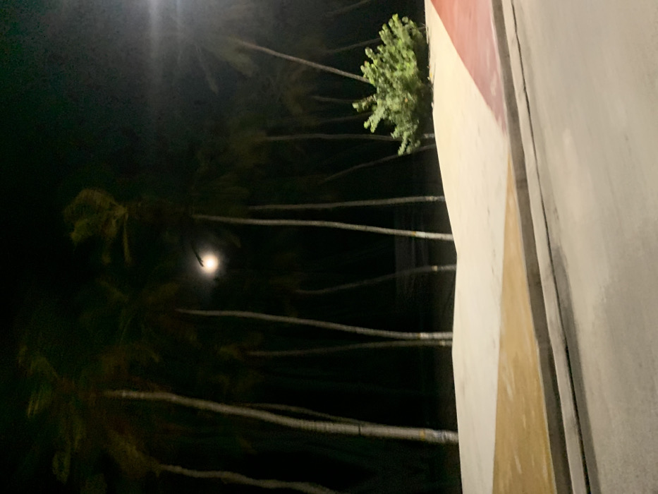 At night, the image shows a row of dark palm trees silhouetted against the sky. The moon is visible through the branches, providing a faint light. A building with a textured wall in neutral tones takes up the right side of the picture, creating a juxtaposition between natural and man-made elements. A leafy green bush is nestled close to the wall, adding a touch of life and color.