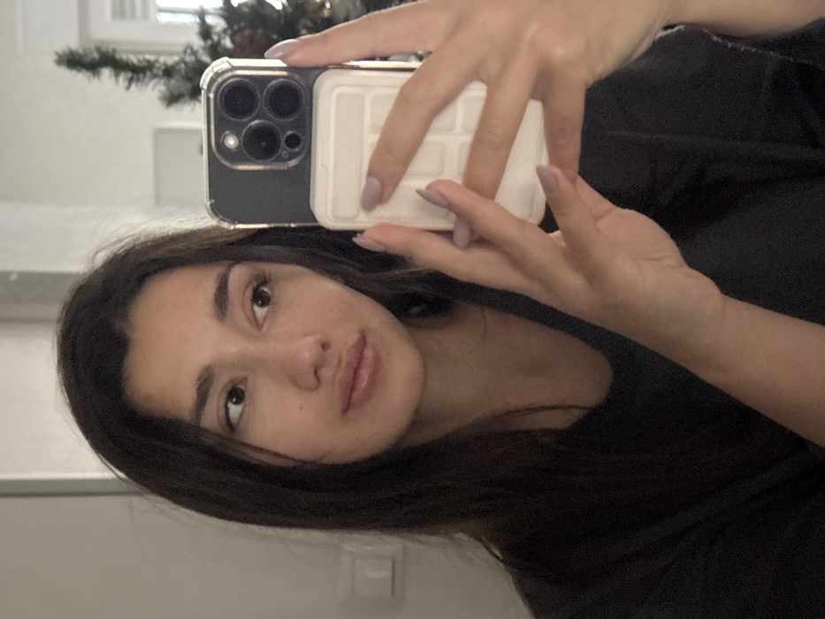 A woman with dark hair and light skin holds a phone with a square, white ice cube tray-like case, taking a selfie. She wears a dark shirt. Her nails are painted a light purple color. The background is blurry, but hints of a white wall and a green plant are visible. The image has been rotated slightly to the side.