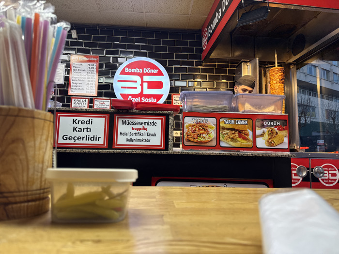 counter of a "Bomba Döner" restaurant with a worker visible in the back preparing döner meat