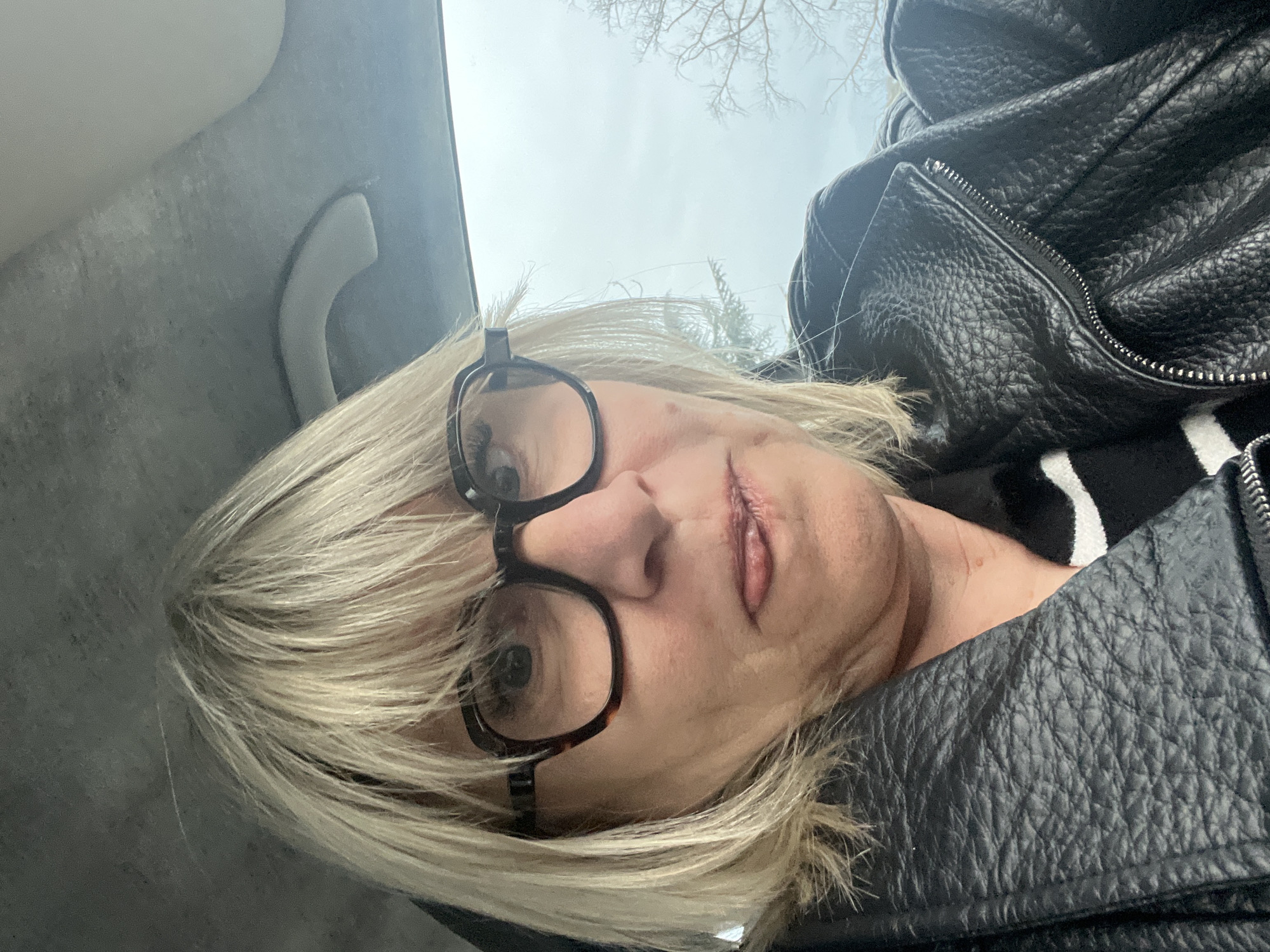 A middle-aged woman with blonde hair and glasses is in a car. She is wearing a black leather jacket over a striped shirt. The interior of the car is visible, including a handle. The background shows a cloudy sky and bare trees, suggesting an outdoor location, but it is impossible to confirm that the location is La Fouillouse, France, without additional information or landmarks.