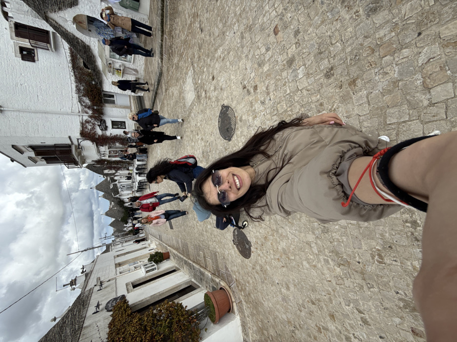 - "The image depicts a woman taking a selfie on a cobblestone street in Alberobello, Italy, characterized by its distinctive white-washed trulli houses with conical stone roofs under an overcast sky" by FM-4ESV13, licensed under CC BY 4.0