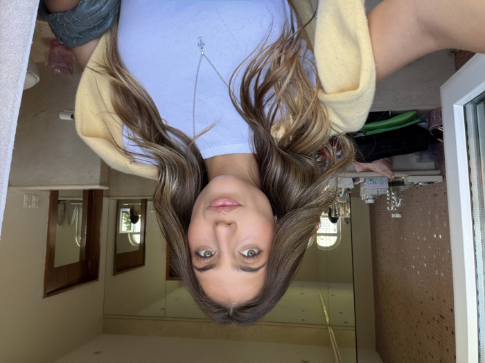 A young adult female is depicted in a selfie taken indoors, within what appears to be a private residence in Mexico City, Mexico. She has long, wavy brown hair with lighter highlights and light-colored eyes, facing the camera with slightly parted lips. She wears a light-colored top, a silver-toned necklace with a small cross pendant, and a light yellow sweater draped over her shoulders. The background indicates a bathroom or dressing area. To the immediate left, a white-framed window provides a view of an exterior wall composed of reddish-brown tiles. Below this window, a countertop holds a tall clear glass bottle, various smaller containers, and folded textile items. The central background features a large wall-mounted mirror reflecting an arched window in an adjacent room and a faint, distant reflection of the subject. To the right of the mirror, two dark wood-framed openings are visible. On the far right wall, a white toilet paper holder is mounted above a pink container and a visible plumbing fixture. The space is illuminated by natural light entering from the left.