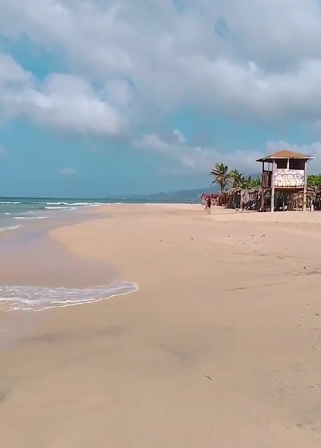 beach. In the foreground is a sandy beach with small waves from the ocean lapping up the sand. Further up the beach towards the right of the frame, there are some people walking on the sand near a wooden lifeguard tower with palm trees around it. In the distance, there is a rocky pier and other people swimming in the ocean. The sky is blue with scattered clouds.