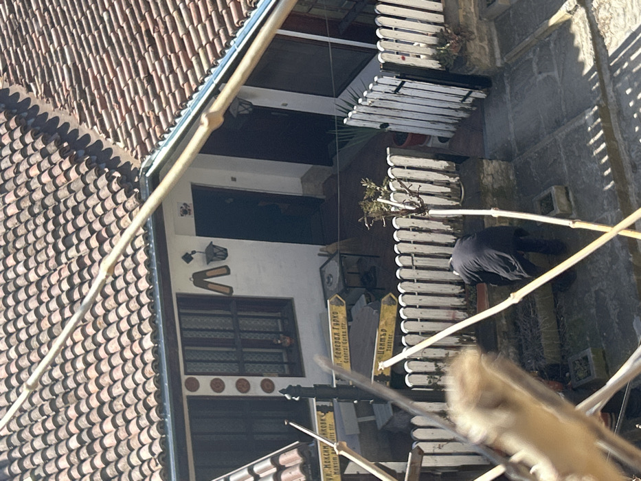 An elevated, downward-angled view depicts a courtyard scene in a city in Unknown, Unknown. The architecture, featuring a building with a red-tiled roof and white facade, suggests a Mediterranean or Eastern European setting. Multiple street signs, written in both Cyrillic and Latin scripts ("ул. Максим Райкович / Maxim Raykovich str.", "пл. Генерал Гурко / General Gurko str.", and "Център / Tsentar"), indicate a Bulgarian-speaking region. The primary building presents a large window with dark frames and internal grates, flanked by four circular, terracotta-colored decorative plates vertically aligned on the left. To the right of the window, two elongated, light-colored decorative elements, resembling stylized garments or objects, hang on the wall above a dark metal lantern sconce. A dark-framed door is visible to the right of these decorations. A broom leans against the white wall near the door. In the foreground, a white picket fence with a dark metal gate encloses part of the courtyard. Potted plants, some appearing dry or dormant, are situated within this fenced area. A single individual, dressed in a dark, long-sleeved garment and dark pants, is bent over, facing away from the viewer, attending to a raised planter bed or container located just outside the picket fence. The ground is paved with stone, and strong shadows are cast, indicating clear daylight conditions. Several out-of-focus, light-colored bamboo poles crisscross the immediate foreground, partially obscuring the view. A black pole with three yellow directional street signs is centrally located within the courtyard.