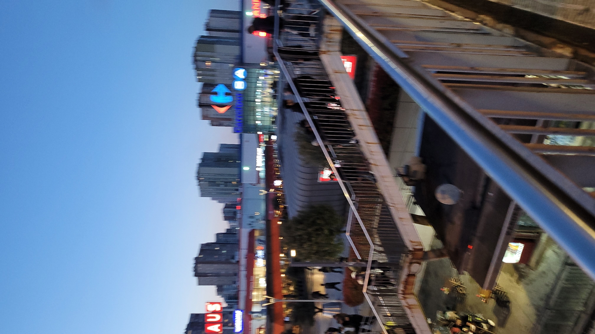 n elevated perspective of a pedestrian walkway or overpass in Esenyurt, Turkey, at dusk. The walkway appears to be made of metal, with visible railings and steps. In the background, there are several high-rise buildings, including a Carrefour hypermarket with its distinctive blue and red logo, and a Bauhaus store with a prominent sign. A group of people can be seen walking on the street below. The lighting suggests it's either early morning or late evening, with a blue sky transitioning to darker shades. Streetlights are illuminated. The image is rotated.