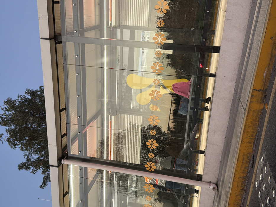 The scene depicts a modern bus stop located in San Andrés Cholula, Mexico. The bus stop structure features transparent glass panels, a light-colored metal frame, and a translucent roof, with a light-colored drainage pipe running vertically on the left support column. Decorative elements on the glass include multiple orange, multi-petaled floral decals and large, abstract yellow shapes. Inside the bus stop, three individuals are present: one person stands on the left, partially obscured, wearing a jacket with a distinct pattern on the back; a child stands adjacent to them, wearing a grey top and blue pants. A third individual is seated on a black metal bench on the right side, observed wearing blue jeans and dark shoes, with a bright pink bag placed beside them on the bench. Reflections on the glass partially obscure the subjects and reveal distorted environmental details, including fragmented text. The background consists of trees with sparse foliage against a pale blue sky. The foreground shows a concrete platform, a yellow-painted curb, and asphalt with embedded reflective road studs. The lighting suggests late afternoon or early evening conditions.