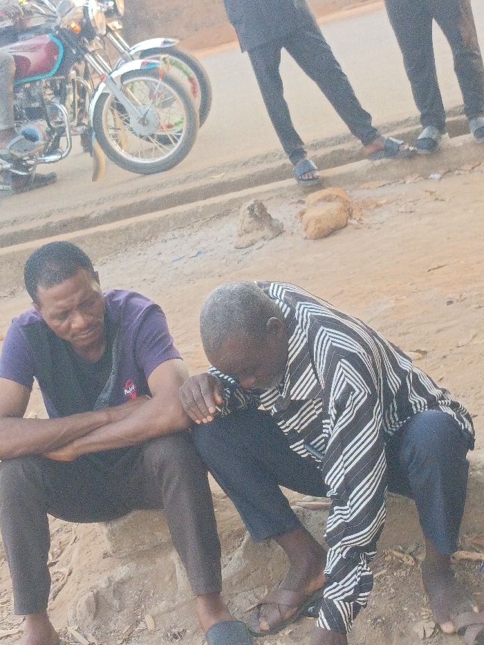 This image captures a street scene in Akwanga, Nigeria. In the foreground, two adult males are seated on a raised earthen or concrete embankment. The man on the left, with dark complexion and close-cropped hair, wears a purple t-shirt over a dark undershirt and dark trousers, with dark sandals. His arms are crossed, and he gazes downwards. The man on the right, appearing older with grey, balding hair and dark complexion, wears a long-sleeved black and white geometrically patterned shirt and dark trousers, with brown sandals. He is hunched forward, resting one hand on his knee, looking towards the ground. Behind the seated individuals, a dusty, unpaved area gives way to a paved road. Two motorcycles are partially visible on the left side of the frame; the front of a red and teal motorcycle with chrome fenders is most prominent, with a person's leg visible on it. Behind this, part of another motorcycle's front wheel and fender are visible. Further back and to the right, two pairs of legs, clad in dark trousers and dark sandals, are visible standing on the road, indicating two additional individuals out of frame. Loose soil and small rocks are scattered on the ground. The lighting suggests daytime.
