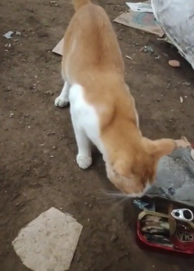 medium-sized, light orange and white cat eating from an open, red sardine can on a brown, dirty ground. There is debris around the cat including a white bag or sack, pieces of wood and plastic, and an unidentified grey material. The cat is facing away from the camera, head down, eating from the can.