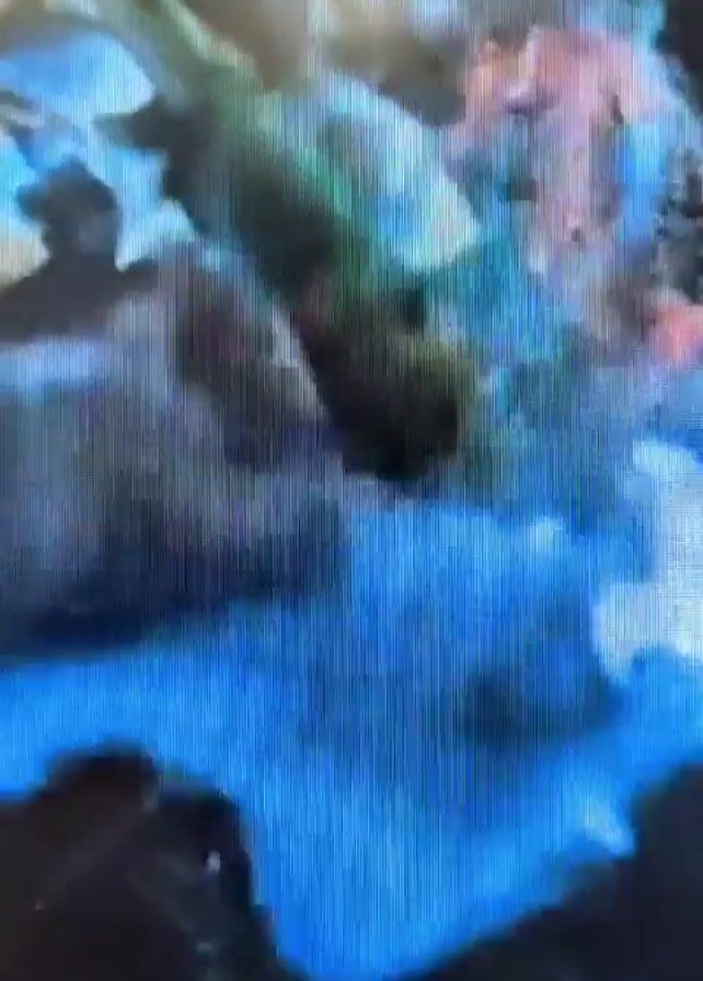 close-up, blurry view of what appears to be a dark figure or object amidst a mix of green and brown elements. The image is indistinct, but there seems to be some movement or distortion present.