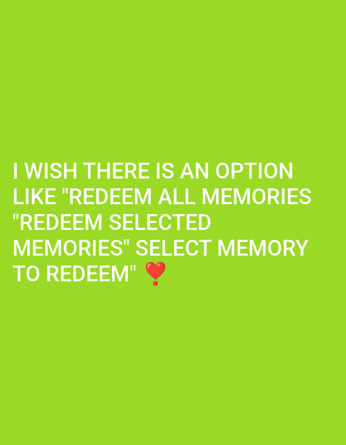 The scene, located in the city of Yelwa, Nigeria, features white text against a solid lime green background. The text is centered horizontally in the lower portion of the image and reads: "I WISH THERE IS AN OPTION LIKE "REDEEM ALL MEMORIES "REDEEM SELECTED MEMORIES" SELECT MEMORY TO REDEEM"". A red heart emoji is present immediately after the text. No people, physical objects, or environmental structures are depicted within the image.