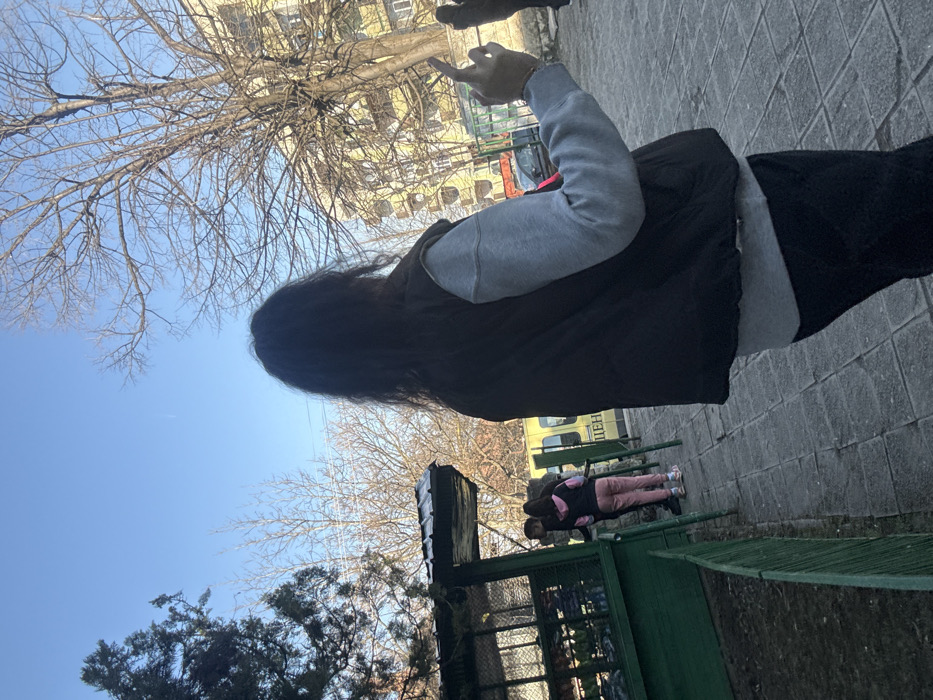 The image displays an outdoor urban scene in Cherven Bryag, Bulgaria, under a clear blue sky. In the foreground, a person with long, dark hair, wearing a dark sleeveless vest over a light gray long-sleeved sweatshirt and dark pants, is depicted from behind, angled towards the right. Their right arm is raised, and the hand extends its middle finger, directed out of frame to the right. To the left midground stands a green structure, possibly a kiosk or stall, with a dark, sloped roof and visible internal shelving or displays behind translucent panels. A low green metal fence fronts this structure. Behind it, two individuals are visible: an adult figure and a younger female dressed in a pink hooded top and pink pants. The ground consists of a gray tiled pavement. In the midground, a yellow vehicle, possibly a van or minibus, is partially visible with the Cyrillic characters "ЩЕН" printed on its side. A dark vehicle is parked further behind. The background features several bare deciduous trees, a prominent multi-story light yellow building with numerous windows, and a dark green coniferous tree on the far left. The sky is bright blue and cloudless.