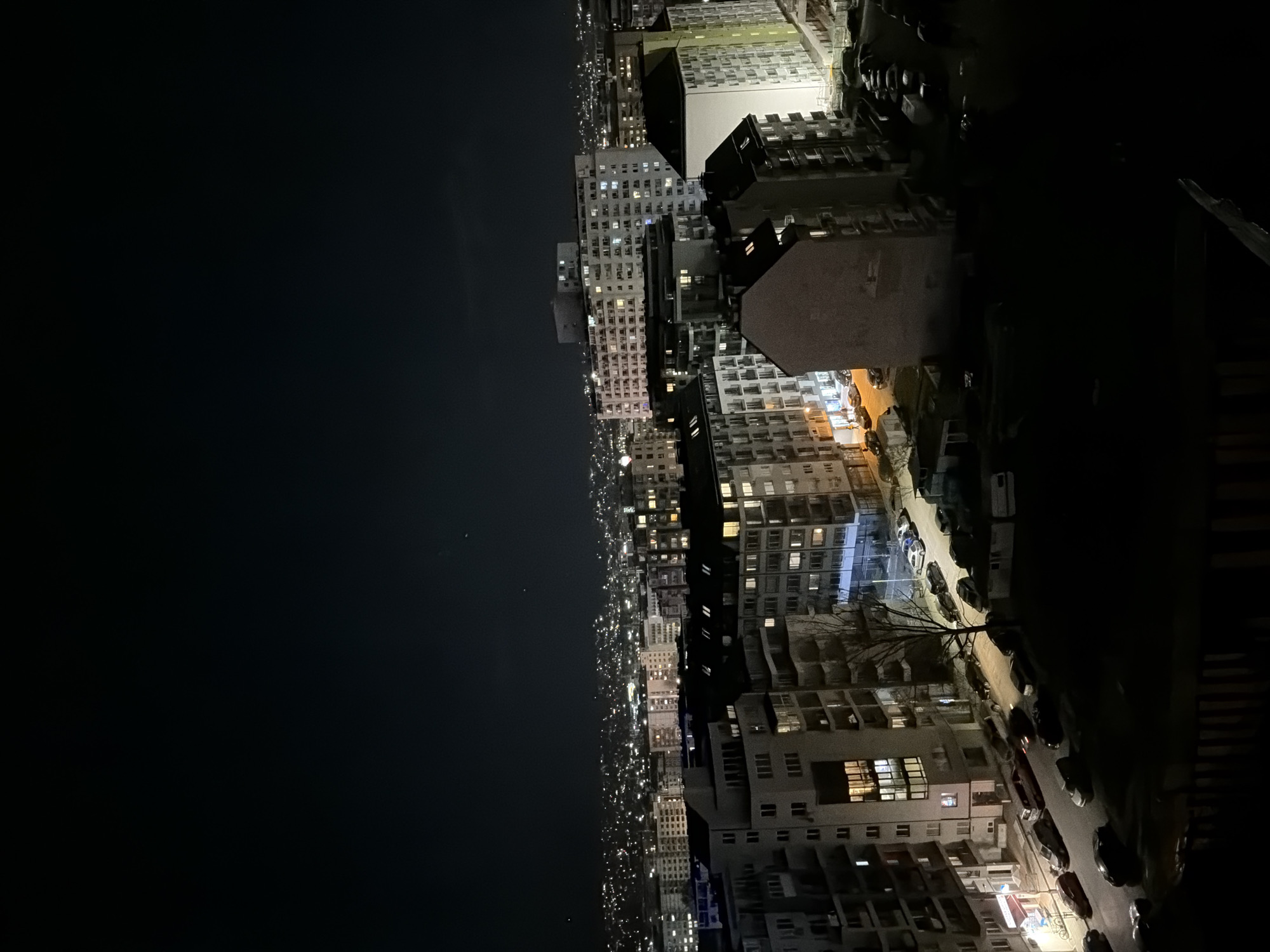 nighttime view of a cityscape, likely taken from a high vantage point such as a balcony or rooftop