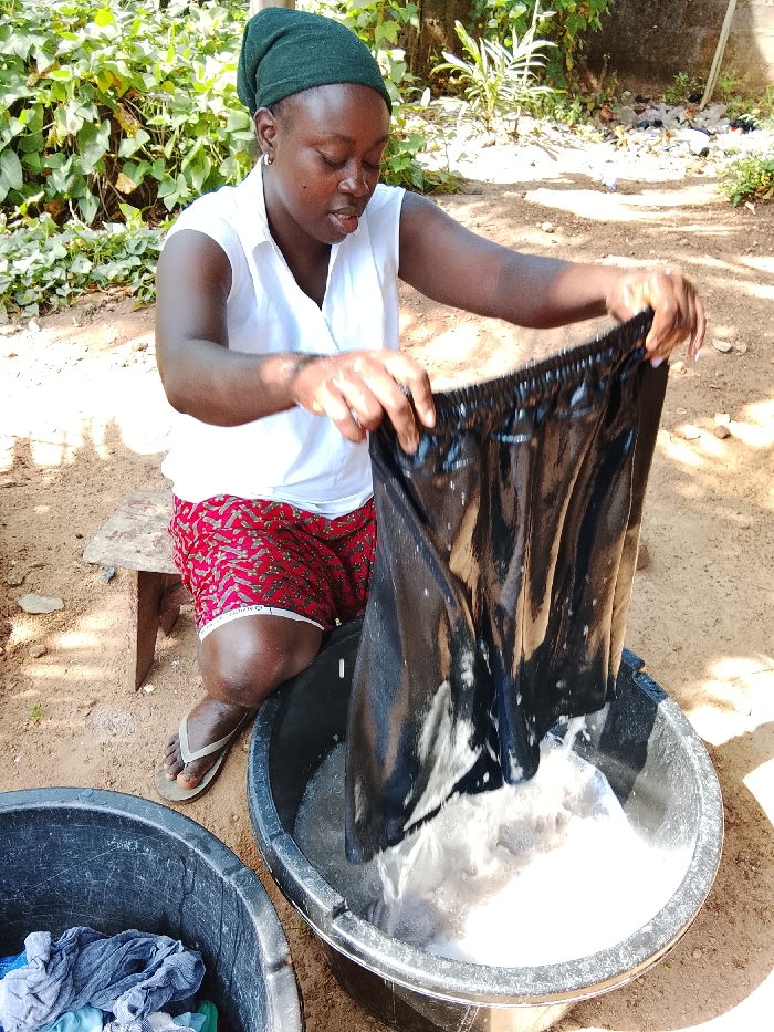An outdoor, daytime scene depicts an adult female of dark complexion manually washing clothes