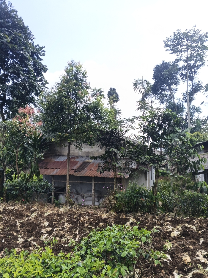 A rural scene depicts a weathered building with a rusty corrugated iron roof. Trees partially obscure the structure. The foreground features tilled soil and low-lying green plants. The sky is overcast. Bags are visible inside a section of the building behind wooden beams. The image suggests a simple, agricultural setting.