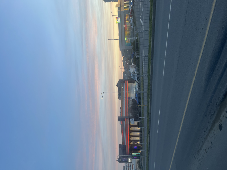 The image captures an urban street scene at dusk on bul