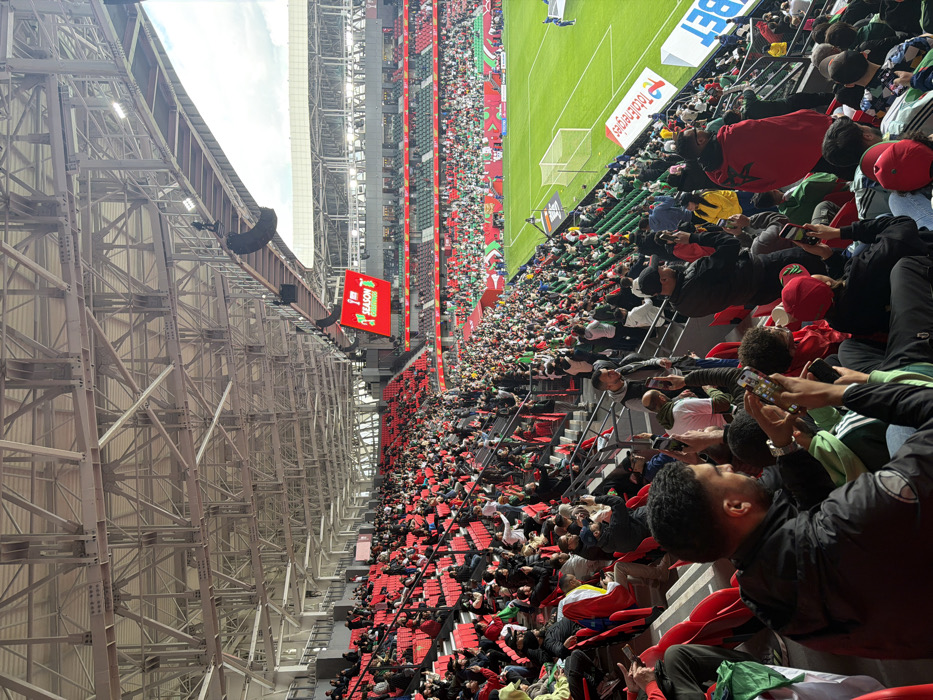 The image captures a vast section of the spectator stands and a portion of the pitch within the Prince Moulay Abdellah Stadium in Rabat, Morocco, during a sporting event, likely a football match
