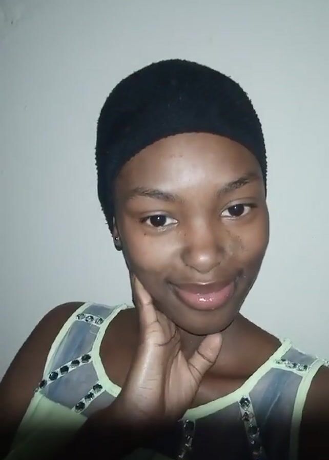 The video features a young Black woman wearing a black head covering and a light green and white top. She is holding her right hand to her cheek in one frame and then holding it up with her fingers outstretched in the other frame. The background is a plain, off-white wall.