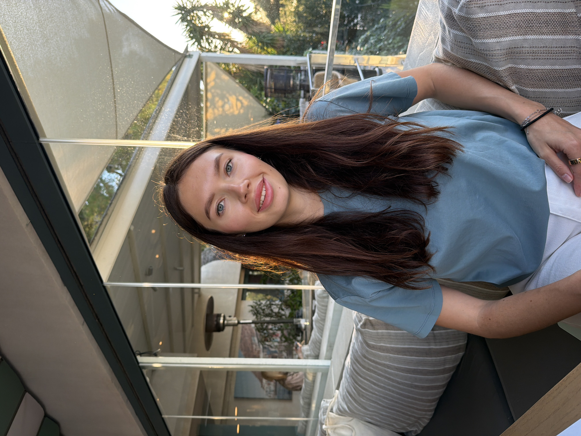 woman seated, likely in a restaurant or cafe within the Vouliagmeni Municipal Unit, Greece, given the architectural style and greenery visible. She is light-skinned with long, dark brown hair. She is wearing a light blue top. Her right arm rests on the striped cushion of the seating area. She is wearing a silver bracelet and a gold ring. The seating area includes striped cushions. Behind her, a window reveals outdoor foliage and what appears to be a terrace heater. The building structure features a modern design with glass panels and a retractable awning. The overall lighting suggests late afternoon or early evening.