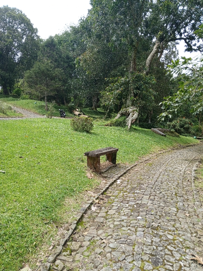 The scene depicts a natural landscape, likely located on Son Tra Mountain (Bán Đảo Sơn Trà) in Đà Nẵng, Vietnam. A winding, irregularly cobbled stone path occupies the right side of the foreground and midground, leading uphill towards the upper right. Adjacent to this path, on the left, rests a weathered, dark brown wooden bench with a simple, rectangular design, positioned on a patch of bright green grass. The grass covers a gently sloping hill that extends upwards towards the background. A small, spherical green bush is situated further up the grassy slope, near the center of the image. Behind and to the left of this bush, a dark-colored scooter or motorcycle is parked partially obscured by foliage on the ascending terrain. The background is characterized by dense, lush green trees and undergrowth, indicative of a forest environment. One prominent tree on the right side of the background features exposed, gnarled roots and a thick, curving trunk. A narrow, unpaved dirt path is visible branching off to the left in the upper midground. The sky above is overcast and bright, partially visible through the tree canopy. No individuals or animals are present, and no actions or interactions are observed within the static scene.