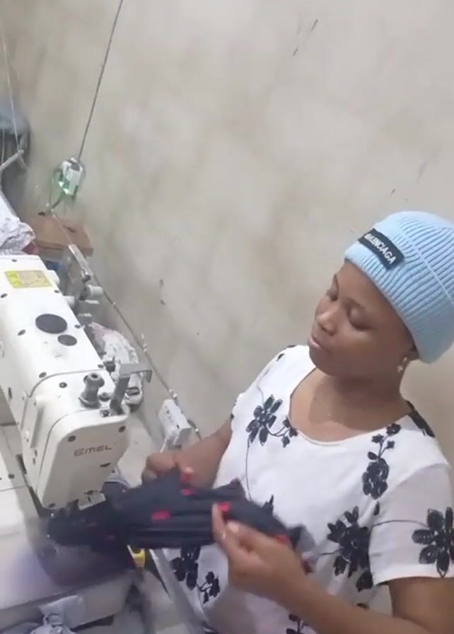 Here is a detailed description of the video: The video features a young woman working at a sewing machine