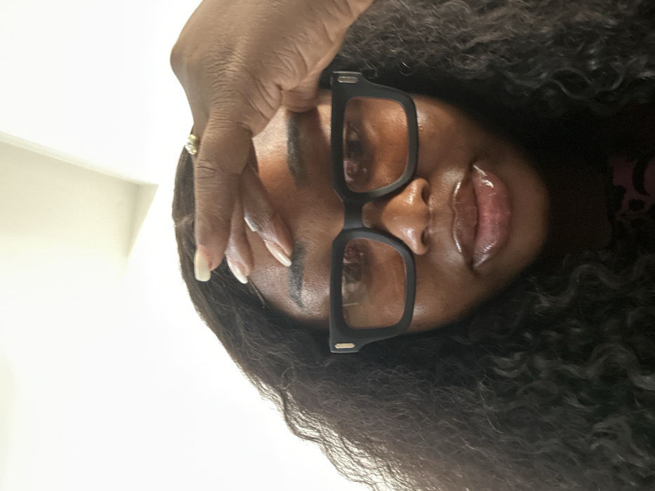 A close-up, head-and-shoulders portrait features an adult individual with dark skin and long, dark, curly hair