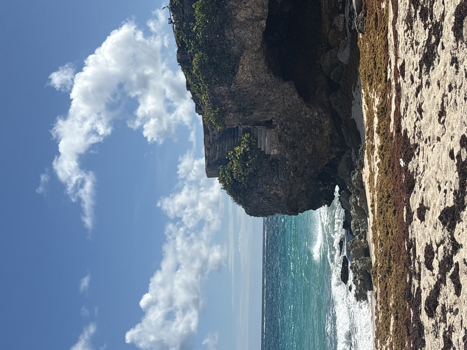 This image depicts a coastal area in Wellhouse, Barbados. The scene is observed under a bright blue sky marked by scattered white cumulus clouds. To the left, the Atlantic Ocean displays a gradient of turquoise to deep blue water, with white-capped waves breaking near the shore. A prominent dark grey rock formation, resembling a cliff, occupies the right and central-right portions of the frame, extending into the ocean. Integrated into the rock face are a series of weathered stone steps leading upwards to a flat, elevated platform. The rock formation is partially covered with dense green vegetation. A dark recess or cave-like overhang is visible at the base of the formation on the far right. The immediate foreground consists of a sandy beach, extensively covered with accumulated brown and dark red sargassum seaweed. Scattered rocks are visible at the interface of the sand and water. No human figures or observable interactions are present within the frame.
