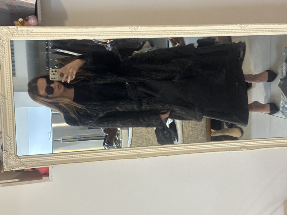 This image depicts a full-length mirror selfie of a female individual, taken within an interior space in the city of Kfar Yona, Israel. The subject, a female with long, straight brown hair, stands facing an ornate, off-white framed mirror. She wears dark, rectangular sunglasses and is dressed in a black ensemble consisting of a long, shaggy or faux fur coat, a dark long-sleeved top, a flowing black midi-skirt, and black pointed-toe high heels. Her right hand, partially obscured by the sunglasses, holds a light-colored smartphone, positioned to capture her reflection. The background, visible in the mirror's reflection, reveals a domestic setting. To the left, a white wall is visible, with a small shelf near the top displaying a pink figurine. To the right, a chrome-finished appliance, possibly a refrigerator, is present. Further right, a clothing rack with various dark garments hangs, and an upholstered, light-colored chair or sofa is partially visible. On the floor in the background, a light brown boot is discernible. The overall environment suggests a room within a residence, likely a bedroom or dressing area, characterized by personal items and clothing.