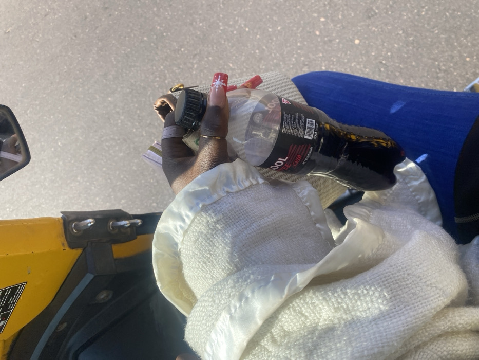 In Dadi Riba, Nigeria, a close-up, downward-angled image depicts the arm and hand of an individual seated within a vehicle. The dark-skinned hand, adorned with a gold ring on the index finger and manicured nails (one visible with a red base and white snowflake design), holds a clear plastic bottle containing a dark beverage. The bottle's label indicates "COOL COFFEE FLAVOUR COLA" and a 500ml volume, topped with a black screw cap. Folded currency notes are visible tucked into the hand. The individual wears a white, textured garment with a smooth, possibly satin, cuff, and a portion of a blue garment is visible on the lap. Behind the hand, a light-colored, woven bag is partially discernible. To the upper left, a yellow vehicle component, likely a door frame or interior panel, with dark structural elements and a visible side-view mirror, indicates an automotive interior. The exterior environment, seen through the vehicle, reveals a light-colored road surface, possibly asphalt, illuminated by direct sunlight.