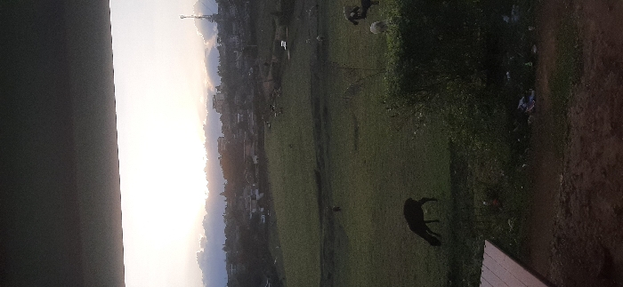 A rural scene shows a green field dotted with grazing animals under a hazy sky. Buildings and a tower are visible on the horizon. A dark cow stands out in the foreground. Some scattered debris lies near a grassy edge. Part of a structure is seen at the bottom right of the frame, while a shadow looms on the left.