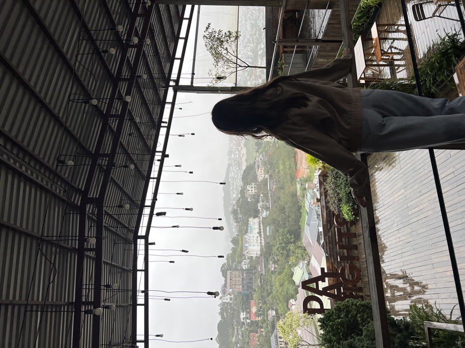 A woman stands on a rainy wooden deck, overlooking a hillside town. She wears a tan jacket and gray pants. Above, a corrugated metal roof structure is adorned with rows of hanging light bulbs. The deck also features plants and metal signage reading "DAGITS." The overall scene suggests a cafe or restaurant with a scenic view.