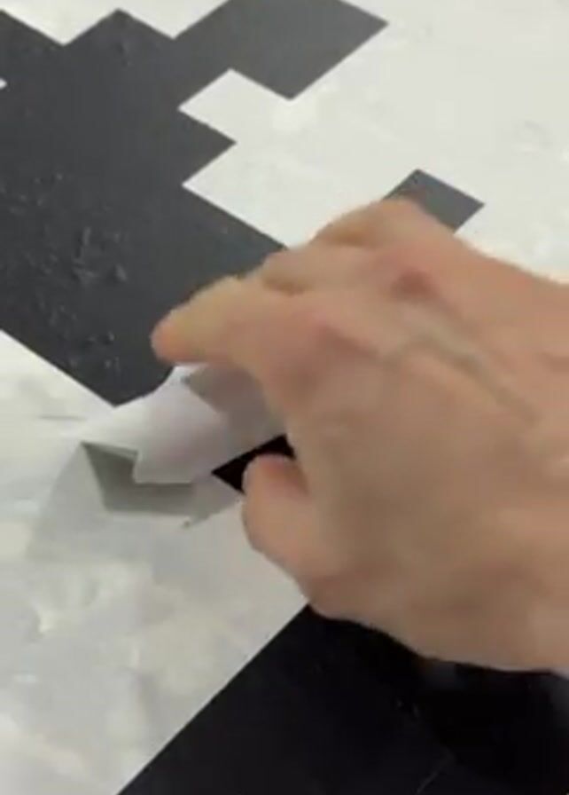 A close-up shot shows a person peeling off a piece of white masking paper from a surface painted with a black-and-white pixelated design, revealing the black paint underneath. The surface appears to be slightly textured. After the paper is peeled off, the black paint of the design is visible against the white background.