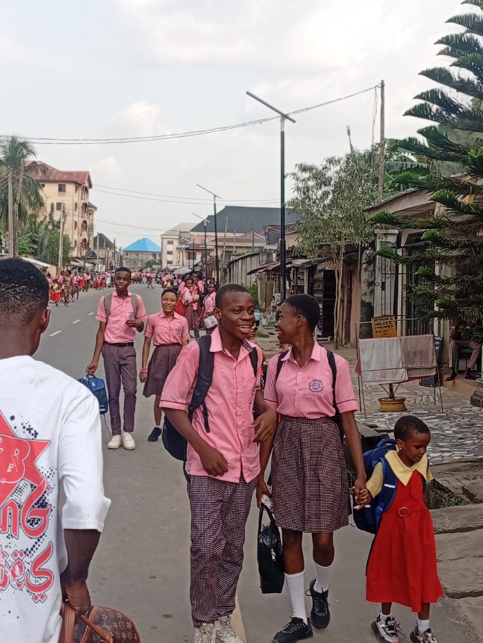 A group of students in pink shirts and skirts/pants are walking down a street. Most have backpacks. Buildings and a row of streetlights line the road. A young girl in a red dress is walking with them. Another man with a handbag is also walking along, facing away from the camera. The scene suggests students are going to or from school.