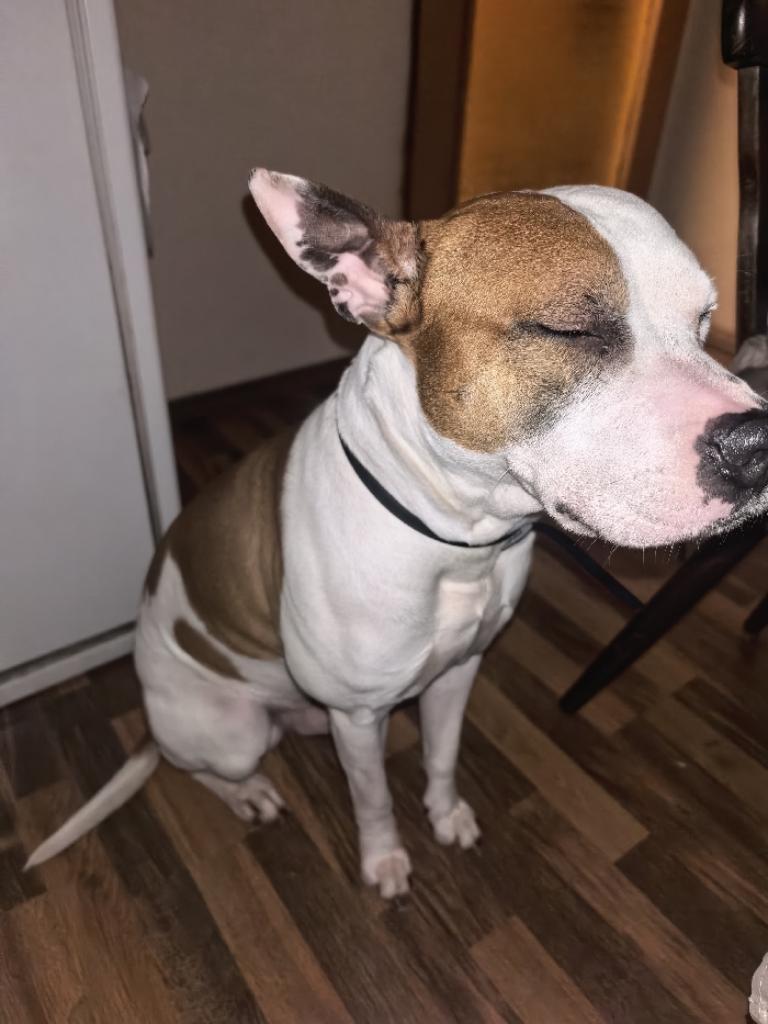 - "A tan and white dog, resembling an American Staffordshire Terrier or pit bull-type breed, is depicted sitting on a medium-brown wood grain floor in an indoor setting in Varna, Bulgaria" by FM-oT3Zp1, licensed under CC BY 4.0