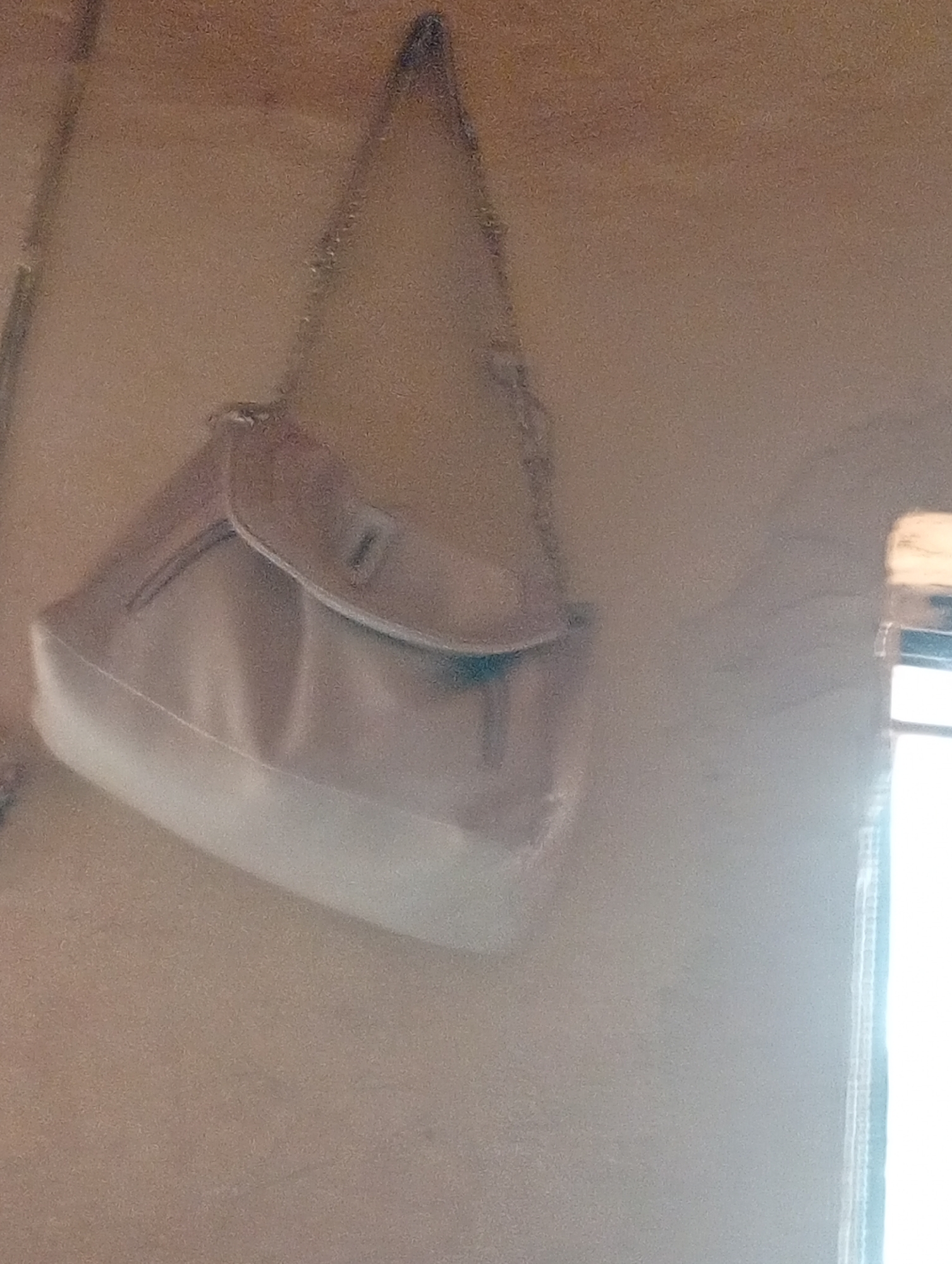 The image displays an indoor scene within Nsukka, Nigeria. A two-toned shoulder bag is suspended by a thin metallic chain strap against a light brown wall. The bag's upper section is light brown, while its lower portion is off-white, and it features a front flap closure with a small metallic accent. A bright, vertical light source, consistent with a window or doorway, is visible along the right edge of the frame. The overall image exhibits a grainy texture and slight blur. No individuals or other distinct objects are present.