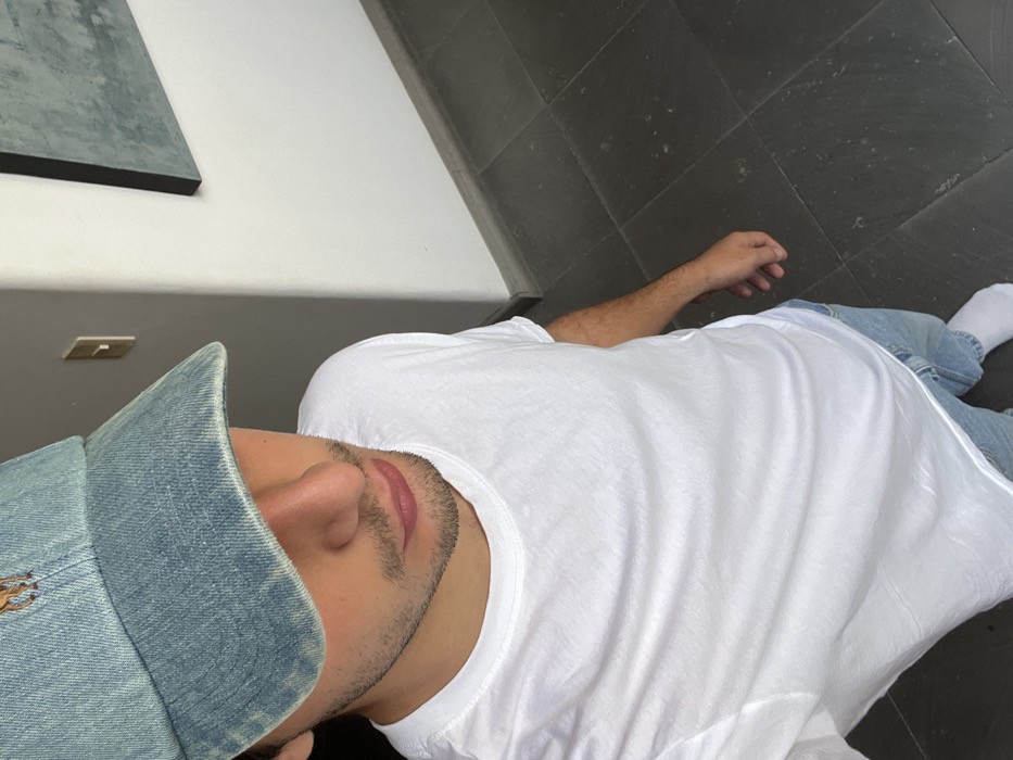 A man reclines, donning a denim bucket hat, white t-shirt, and light blue jeans, with a white sock peeking out. He lies against a backdrop of grey tile flooring and a white wall featuring a modern art piece. The man's face, particularly his nose and lips, is prominently displayed due to the angle. A light switch is visible on the white wall near the man's head. The overall perspective is a close-up, tilted downward shot.