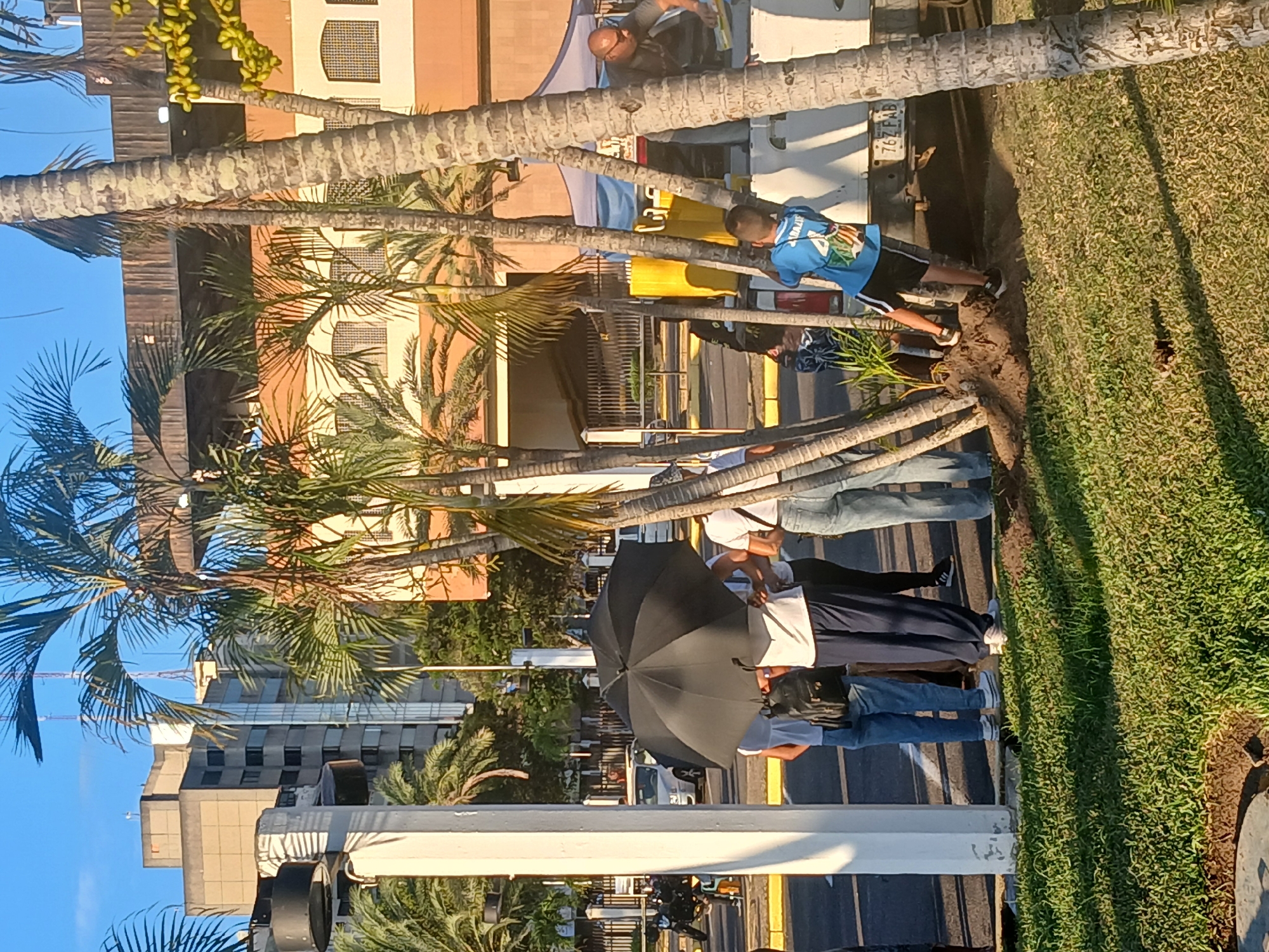 street scene in Ciudad Guayana, Venezuela. Several people are standing on a sidewalk adjacent to a grassy area with palm trees. Some individuals are under a black umbrella. A white truck is parked near the curb, and at least one person is working around the truck's bed. Buildings are visible in the background, including a multi-story structure and a building with tan exterior walls. The sky is blue. A traffic light is also visible.