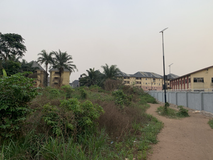 The image displays an outdoor scene in Ihiagwa, Nigeria, under an overcast, hazy sky. The foreground features a dirt path, light brown in color, winding slightly from the lower left to the mid-right. To the left of the path, dense, wild green and brown vegetation, including shrubs and grasses, covers the terrain. Small patches of green grass and minimal debris are visible along the path's edges. In the midground, a grey concrete block wall, topped with what appears to be razor wire or barbed wire, runs parallel to the path on the right side. A tall, dark grey streetlamp pole with a white upper section and a solar panel attached to its top stands upright next to the path and wall. A second, similar streetlamp is visible further in the background along the wall. Behind the wall, to the far right, a light yellow/tan building with a red-brown roof and multiple rectangular windows is visible. The background on the left reveals multiple tall palm trees and dense green foliage. Partially obscured by this vegetation are several multi-story buildings, predominantly light yellow/tan, with dark roofs. Two of these buildings have distinct pointed or conical roof sections. Further to the right in the background, additional multi-story buildings, similar in color and style, are visible, suggesting a cluster of residential or institutional structures. No individuals are present, and no specific actions are depicted within the frame.