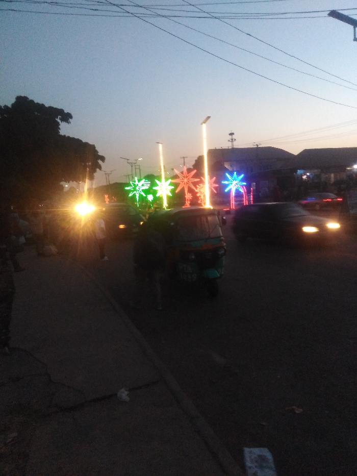 A street scene at dusk features a row of star-shaped lights in green, yellow, red, and blue illuminating the background. A three-wheeled vehicle, possibly a tuk-tuk, stands out in the foreground. Other vehicles and people are visible, but partially obscured by the dim lighting. Streetlights line the road, and power lines stretch across the sky. Buildings are silhouetted in the distance.